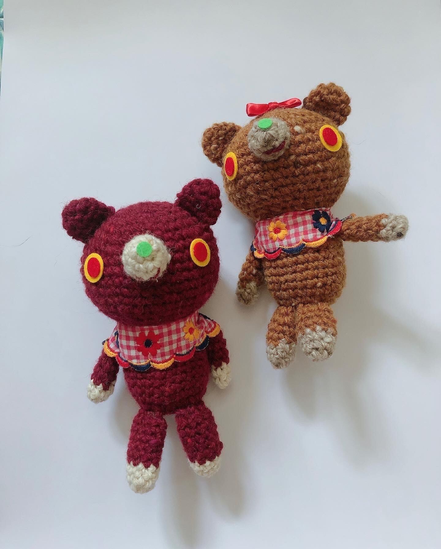 手編みのあみぐるみのクマ、赤とベージュ